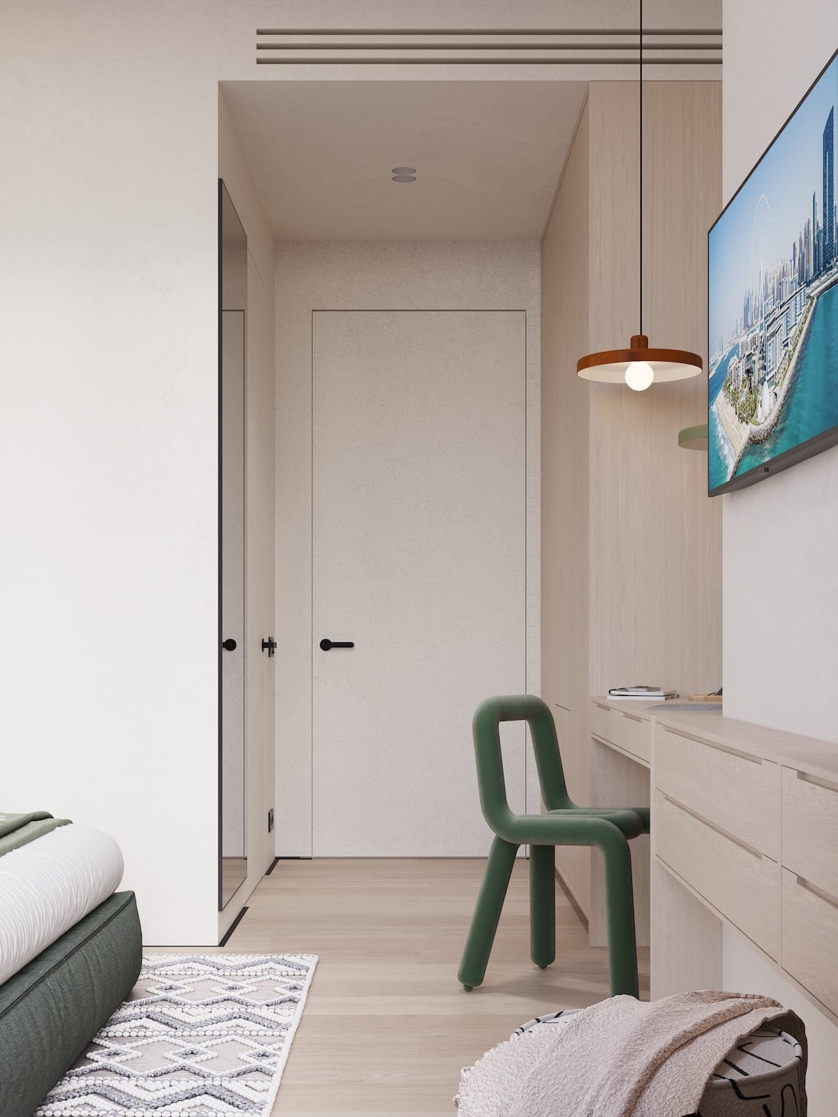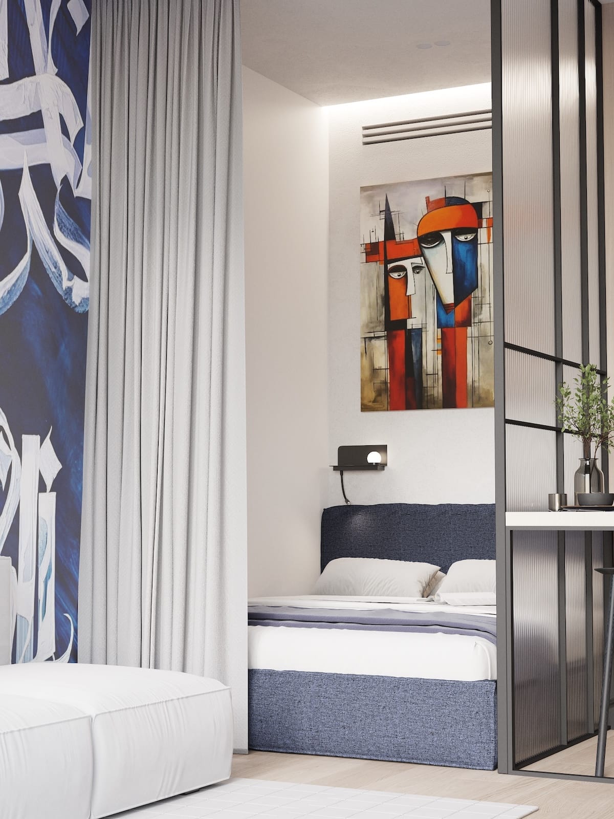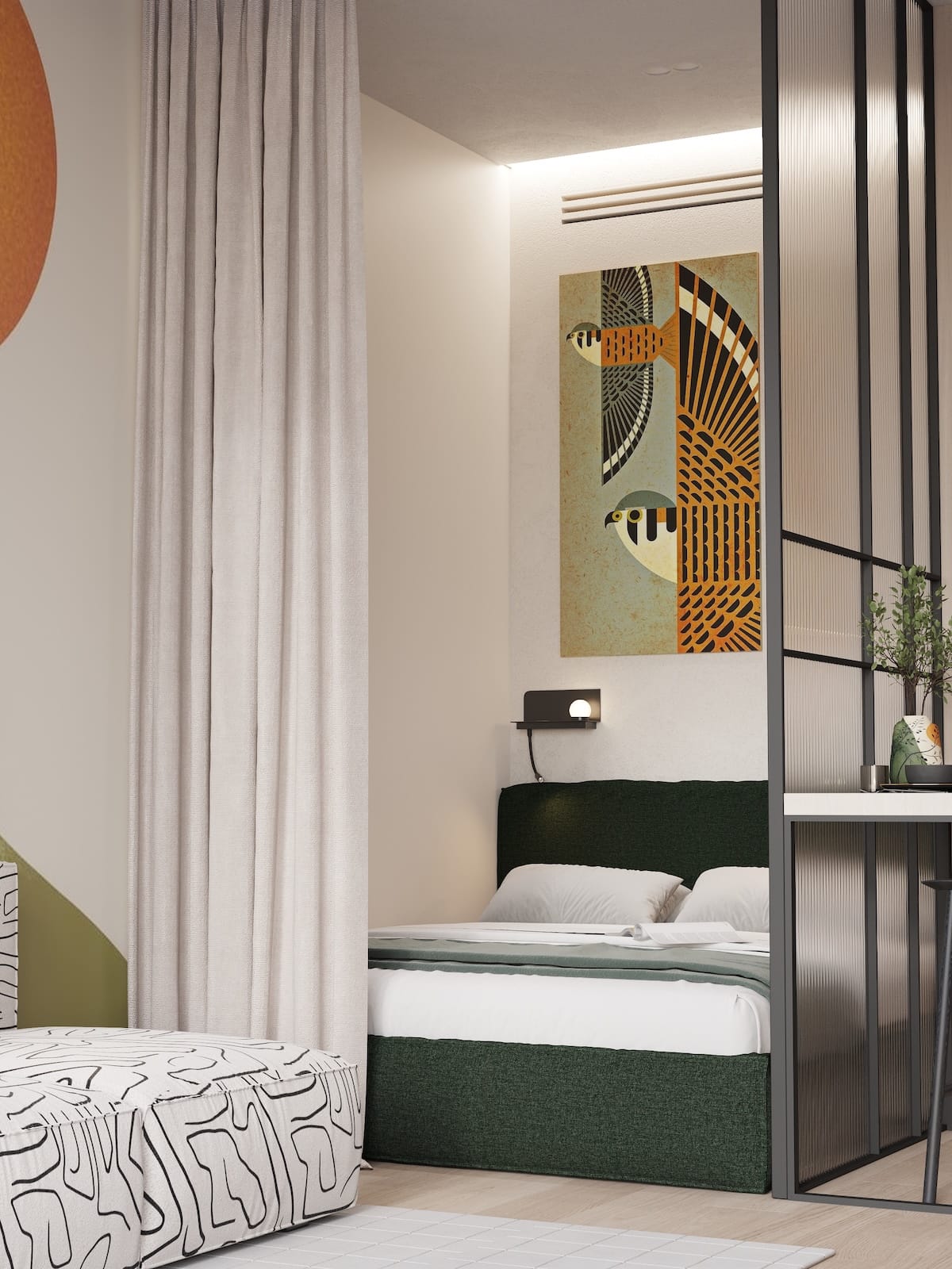 Cozy, fully furnished blue or green 1 Bedroom apartment who love comfort and privacy. Access stylish shared spaces and plug into the ROOM8 community in the heart of Dubai