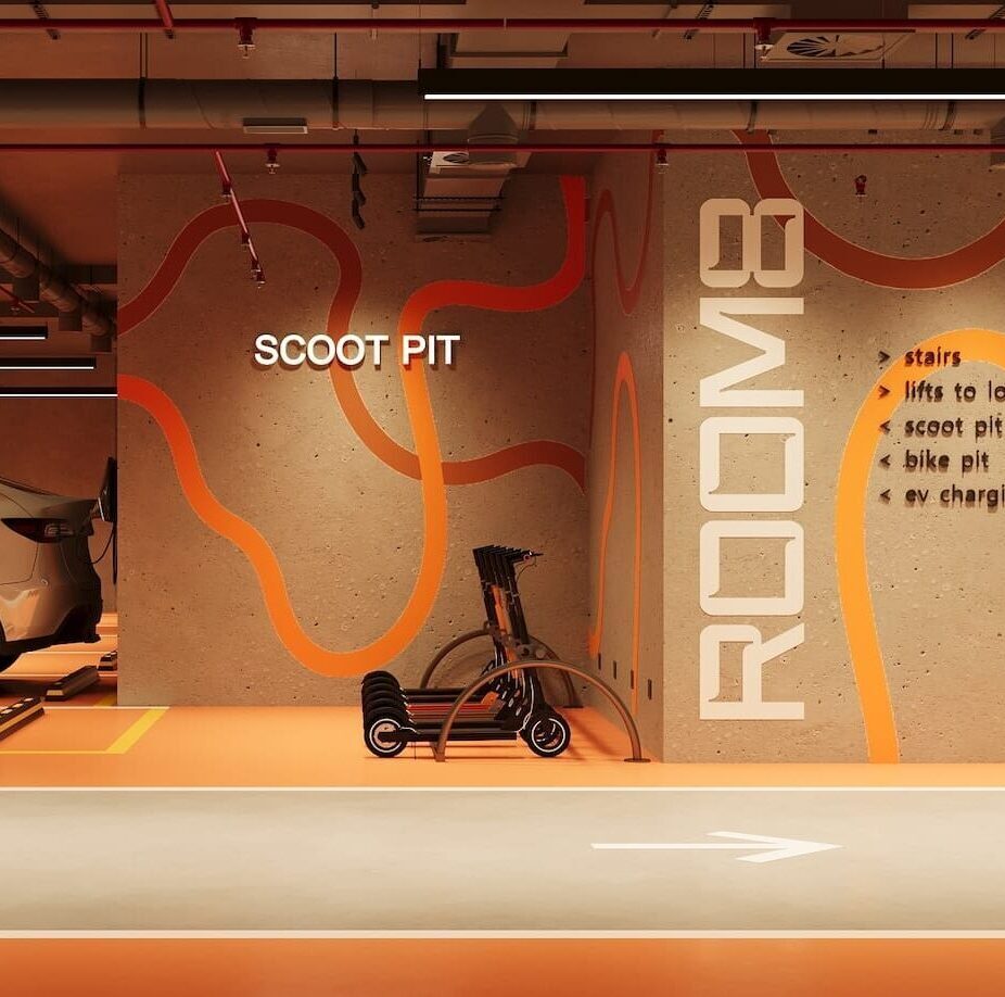 We’ve set up specialized parking zones for bicycles and e-scooters on every parking level! Spaces are limited, so please check with the ROOM8 admin team for availability, and always use your personal lock.